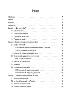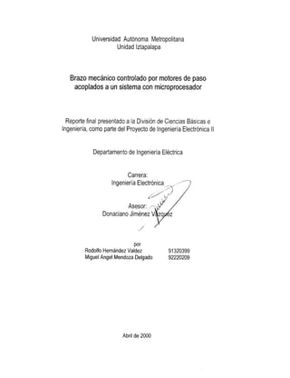 Este documento presenta el reporte final de un proyecto para diseñar y construir un brazo mecánico controlado por una computadora personal a través de motores de paso. El objetivo era conocer las ventajas y desventajas del uso de la computadora y los motores de paso en la implementación de un brazo robótico. El reporte incluye la introducción al campo de la robótica, las partes de un robot, los motores de paso y el diseño del circuito de interfaz entre la computadora y los motores para controlar el brazo mecánico a través