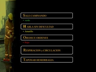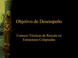 Este documento habla sobre técnicas de búsqueda y rescate en estructuras colapsadas. Explica el procedimiento de triage START para clasificar a las víctimas en categorías de acuerdo a su pronóstico vital usando cintas de colores. También describe formas de apilamiento en estructuras colapsadas y la señalización INSARAG para la respuesta internacional en búsqueda y rescate. El objetivo es conocer estas técnicas para mejorar el trabajo de rescate en desastres.