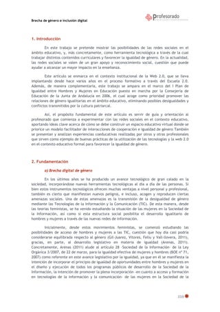Este documento analiza el potencial de las redes sociales en educación para promover la igualdad de género y reducir la brecha digital. Explica que aunque el acceso a las TIC es ahora más equitativo entre hombres y mujeres, todavía existen diferencias en el uso y actitudes hacia la tecnología. Propone el uso de redes sociales en educación para crear espacios virtuales que fomenten la cooperación e igualdad entre ambos géneros. También presenta ejemplos de cómo otras escuelas han utilizado con éxito las TIC