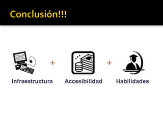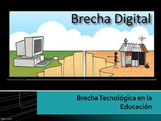 Este documento discute el tema de la brecha digital en la educación. Aborda conceptos clave como las expectativas de incluir las tecnologías de la información y comunicación (TIC) en las instituciones educativas, para preparar a los estudiantes y mejorar su rendimiento académico. También señala los desafíos de cerrar la brecha digital, como mejorar la infraestructura tecnológica, las habilidades digitales y el cambio cultural para un uso efectivo de la información. Finalmente, presenta ejemplos de
