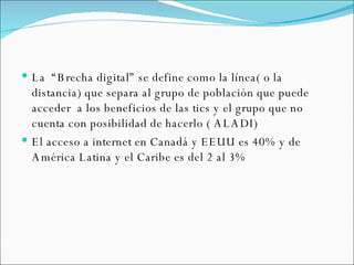 El documento describe la brecha digital en América Latina y el Caribe, donde el acceso a Internet es mucho menor que en países desarrollados. Varios países han implementado programas nacionales para instalar computadoras en escuelas públicas y telecentros comunitarios con el fin de reducir esta brecha y promover el desarrollo a través del uso de las TIC. Sin embargo, persisten dificultades como la falta de capacitación y soporte técnico que obstaculizan estos esfuerzos.