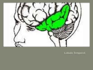 El documento describe las funciones del lóbulo temporal del cerebro. El lóbulo temporal está involucrado en tareas visuales complejas como el reconocimiento de caras, procesa información auditiva, contribuye al equilibrio y balance, y regula emociones. También juega un papel importante en la memoria al almacenar recuerdos de palabras y nombres.