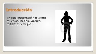 Este documento presenta la visión, misión, valores, fortalezas y red personal de aprendizaje de Brenda Gallegos Ruiz. Su visión es terminar su carrera en marketing empresarial y trabajar en una empresa grande, destacándose profesionalmente. Su misión es definir sus objetivos para la vida con confianza en sí misma. Sus valores incluyen la integridad, honestidad y responsabilidad. Sus fortalezas son la experiencia, liderazgo, disciplina, compromiso y motivación.