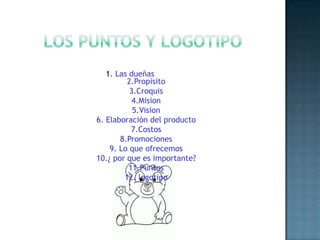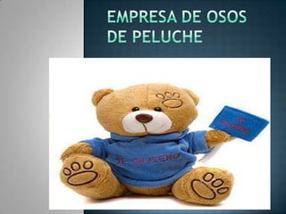 Este documento presenta una empresa de osos de peluche llamada "Empresa de osos de peluche+". Resume los puntos principales de la empresa, incluyendo las dueñas, la misión de darse a conocer en todas partes, cómo se elabora el producto en tres pasos, los rangos de precios de los peluches de diferentes tamaños, las promociones de compra, qué ofrecen, por qué es importante el negocio, y su visión de dar a conocer la importancia de los peluches.