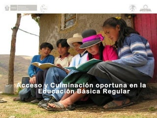 El documento describe los esfuerzos del gobierno peruano para mejorar el acceso y la culminación oportuna en la educación básica. Señala que 2.3 millones de niños y adolescentes entre 3 y 16 años no tienen acceso a la educación básica regular o están en riesgo de abandonarla. El gobierno ha implementado programas como la educación inicial, secundaria rural mejorada, secundaria tutorial y de alternancia para aumentar la cobertura, enfocándose en poblaciones indígenas, rurales y pobres con mayores brechas. Tamb