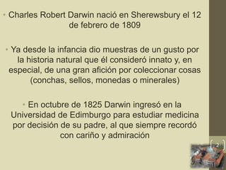 Charles Darwin nació en 1809 en Inglaterra. En 1831, embarcó en el HMS Beagle para un viaje de 5 años que lo llevó a realizar observaciones científicas que fueron fundamentales para desarrollar su teoría de la evolución por selección natural. Publicó El Origen de las Especies en 1859, explicando cómo la variación y selección natural conducen a la formación de nuevas especies, pero se enfrentó a fuerte oposición religiosa. Darwin pasó el resto de su vida desarrollando y defendiendo su teoría
