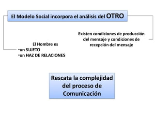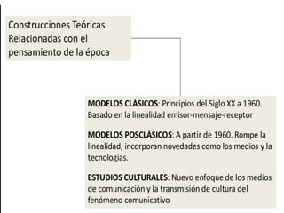 Este documento presenta diferentes modelos de comunicación, incluyendo modelos clásicos, el modelo social, el modelo crítico de la Escuela de Frankfurt y los estudios culturales. Cada modelo ofrece una perspectiva diferente sobre cómo se produce y recibe la comunicación en la sociedad.