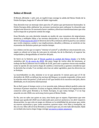 El Brexit marcó la salida del Reino Unido de la Unión Europea tras 47 años, resaltando la necesidad de que la UE realice cambios para abordar las causas de este divorcio. La incertidumbre sobre la relación futura entre ambas partes persiste, con riesgos significativos para el Reino Unido si no se logra un acuerdo en 2020. Esta decisión ha fracturado la unidad británica y plantea desafíos tanto económicos como sociales en la nueva etapa que comienza.
