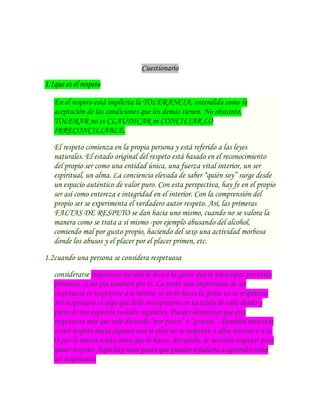 El respeto es fundamental en todas las relaciones. Para ser respetuoso, uno debe respetarse a sí mismo y tratar a los demás con dignidad, compasión y tolerancia. En el hogar, la escuela y otros entornos públicos, el respeto promueve la armonía, la comunicación positiva y un clima agradable para todos. Ser responsable con las actividades del Sena y otros compromisos requiere respetar a los instructores y cumplir con los deberes asignados. El respeto trae beneficios como la aceptación social y buenas relaciones que