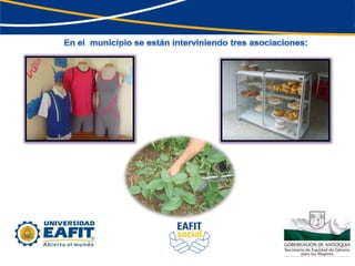El documento resume información sobre el municipio de Briceño en Colombia. Tiene una población de 8,779 habitantes, la mayoría de los cuales viven en zonas rurales. La economía se basa en la agricultura, minería y madera. Se están apoyando tres asociaciones de mujeres en el municipio, incluyendo una dedicada a la confección, otra al cultivo de moras, y una tercera a la panadería y repostería.