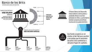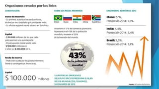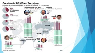 El documento describe el origen y evolución del grupo BRICS, formado inicialmente por Brasil, Rusia, India y China en 2001 y ampliado posteriormente con Sudáfrica. Explica que estos países representan más del 40% de la población mundial y el 30% de la superficie terrestre, y juntos tienen una quinta parte del PIB mundial, por lo que se les considera futuros líderes económicos a nivel global. Sin embargo, en los últimos años su liderazgo conjunto se ha vuelto incierto debido a problemas económicos individuales y des