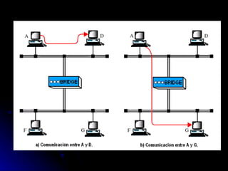 El documento describe las funciones y características de un puente de red. Un puente conecta dos redes que usan el mismo protocolo y funciona en la capa de enlace de datos (capa 2) para filtrar y reenviar tramas entre redes. Al almacenar las direcciones MAC de los equipos, un puente puede determinar en qué lado de la red se encuentran el emisor y el destinatario de una trama y decidir si reenviarla o no entre redes.