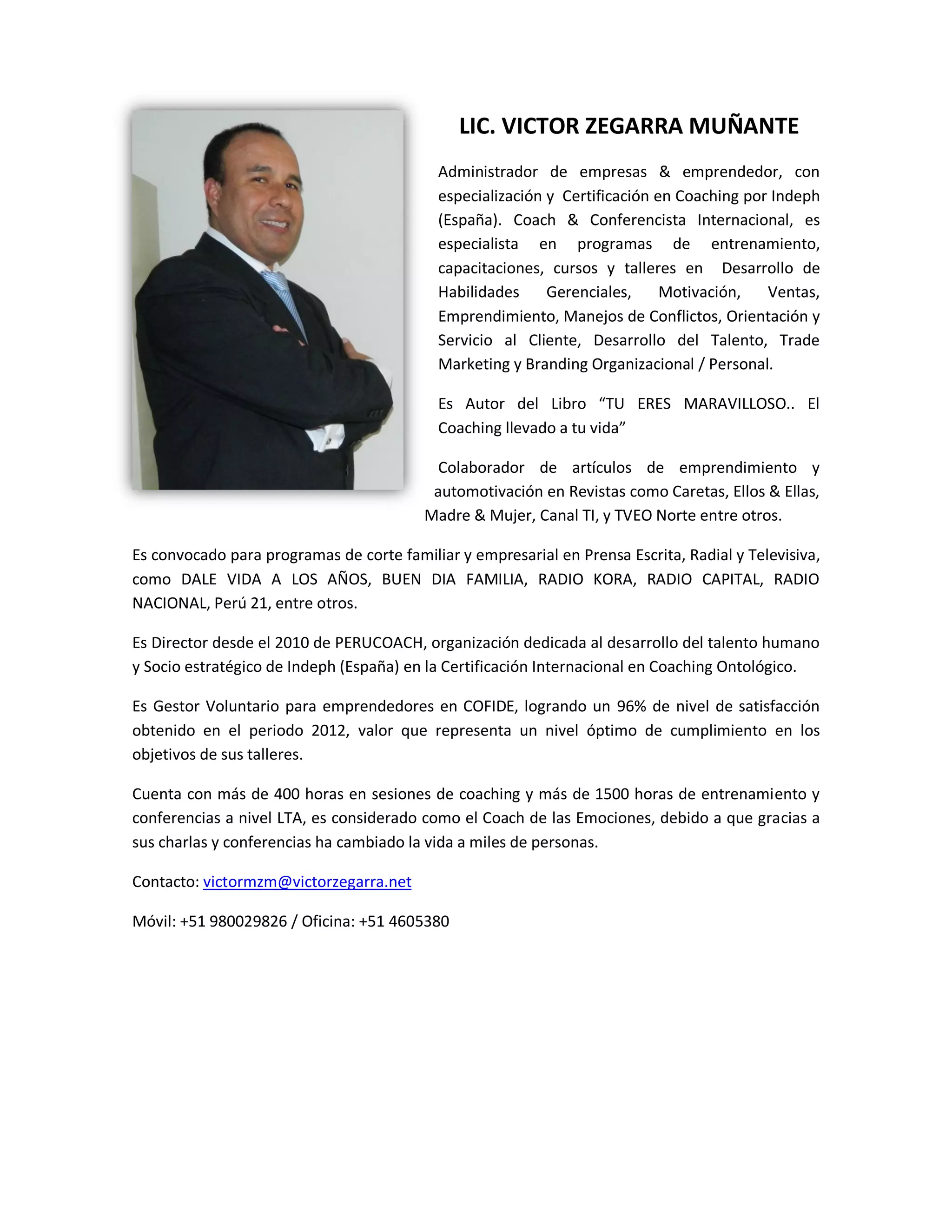 Victor Zegarra es un coach y emprendedor peruano con especialización en coaching. Es autor de un libro sobre coaching y ha impartido más de 400 horas de sesiones de coaching y 1500 horas de entrenamiento y conferencias. También ha colaborado en varias revistas y programas de televisión y radio sobre temas de emprendimiento y motivación. Actualmente dirige una organización dedicada al desarrollo del talento humano.