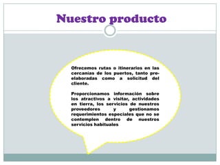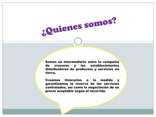 Este documento presenta una empresa de intermediación entre cruceros y proveedores de servicios turísticos en tierra en República Dominicana. La empresa crea itinerarios personalizados, reserva servicios y negocia precios, ofreciendo rutas preestablecidas y a la medida en los alrededores de puertos. Sus objetivos son posicionarse como especialista en recorridos temáticos cercanos a puertos dominicanos y atraer nuevos clientes diferenciándose por la especialización de sus servicios.