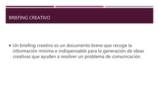 El documento describe un briefing creativo, un documento breve que recoge la información mínima necesaria para generar ideas creativas que ayuden a resolver un problema de comunicación. Explica que un briefing creativo debe ser breve, abierto y flexible, e incluir información sobre el producto/servicio, objetivo, público objetivo, estrategia, propuesta, argumentos, tono de voz, competencia y otros detalles. El objetivo es proporcionar una guía estratégica para el desarrollo de una campaña de comunicación.