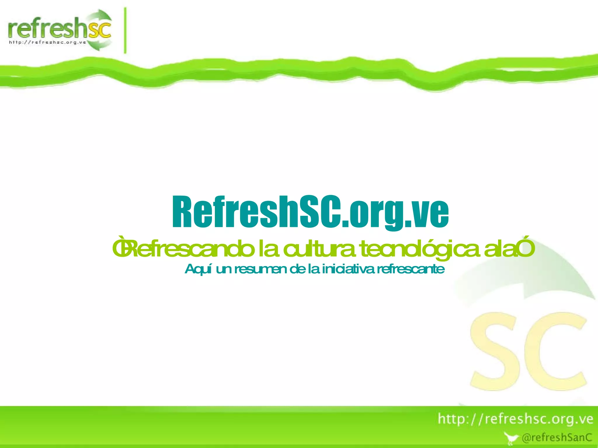 RefreshSC es una comunidad en Venezuela cuyo objetivo es compartir conocimientos tecnológicos y refrescar la cultura tecnológica local. Se reúne cada segundo sábado del mes siguiendo el modelo de "desconferencia" para discutir temas como desarrollo web, programación, redes sociales y más. La comunidad está abierta a todo público interesado en aprender sobre tecnología, ya sea estudiantes, profesionales u otras personas curiosas.