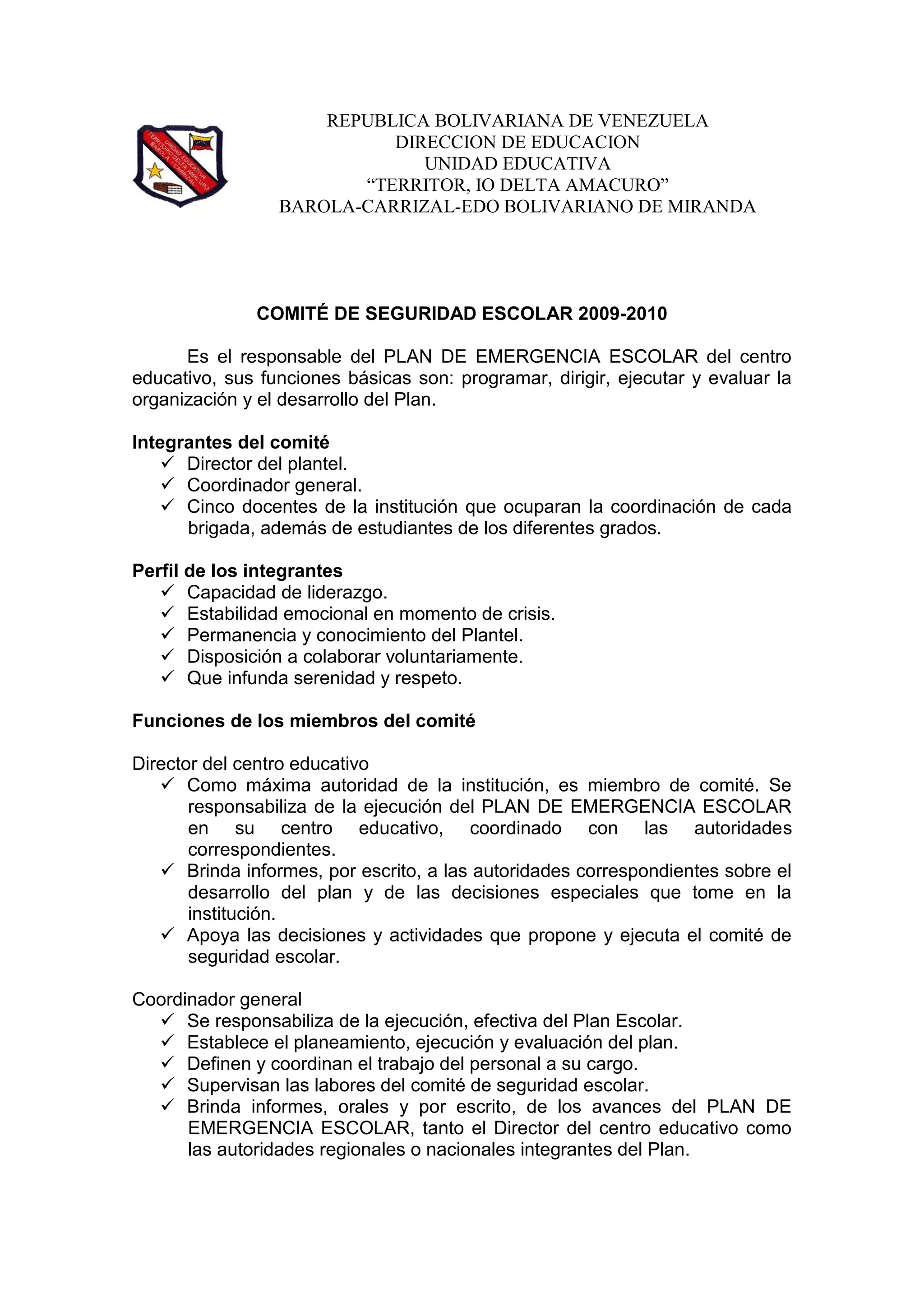 El documento describe las funciones y responsabilidades del Comité de Seguridad Escolar de una escuela en Venezuela. El comité se encarga de desarrollar y ejecutar el Plan de Emergencia Escolar y está compuesto por el director, coordinador general y cinco docentes coordinadores de brigadas. Las brigadas son grupos responsables de evacuación, primeros auxilios, vigilancia, prevención de incendios y uso de extintores. El documento explica en detalle los deberes de cada brigada y miembro del comité para garantizar una respuesta efectiva a emerg