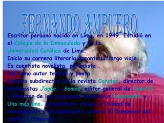 Fernando Ampuero es un escritor peruano nacido en 1949 en Lima. Estudió en el Colegio de la Inmaculada y la Universidad Católica de Lima e inició su carrera literaria durante un largo viaje. Ha trabajado como periodista, editor y director de varias revistas y programas de televisión. Entre sus obras literarias más destacadas se encuentran las novelas Caramelo verde y Puta linda, y colecciones de cuentos como Deliremos juntos y Molos modales.