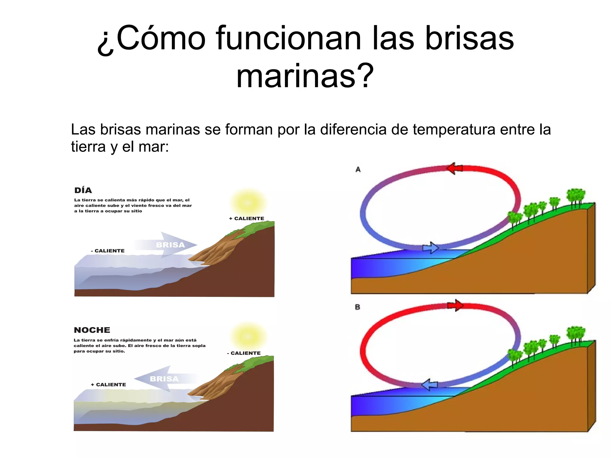 Las brisas marinas se forman debido a las diferencias de temperatura entre la tierra y el mar, donde la tierra se calienta y enfría más rápido que el agua, lo que causa que el aire sobre la tierra sea más caliente o más frío que el aire sobre el mar, haciendo que el aire se mueva hacia arriba o hacia abajo y creando vientos que soplan tierra adentro durante el día y mar adentro durante la noche.