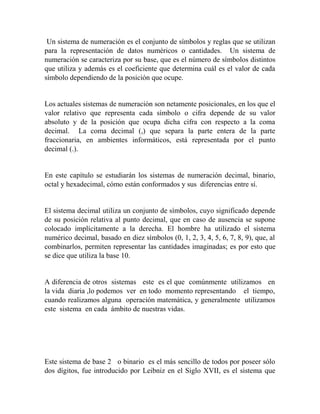 Este documento explica diferentes sistemas de numeración, incluyendo el decimal, binario, octal y hexadecimal. Describe que un sistema de numeración utiliza símbolos y reglas para representar cantidades numéricas y se caracteriza por su base, o el número de símbolos distintos. Luego procede a explicar cada sistema en detalle, incluyendo sus símbolos, cómo representan valores, y en qué contextos son utilizados, particularmente en sistemas digitales y de computación.