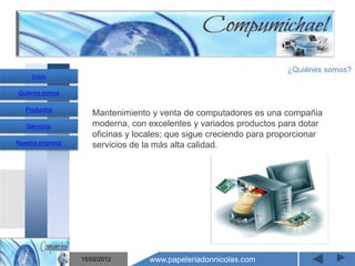 El documento describe una empresa llamada Mantenimiento y venta de computadores compumichael que ofrece servicios de mantenimiento y venta de computadores. La empresa proporciona una variedad de productos como impresoras, portátiles, monitores, mouse, teclados y ofrece servicios como manejo de inventarios, mantenimiento preventivo, transporte y domicilios, asesores personalizados, línea de atención al cliente, página web y correo electrónico.