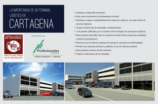 El documento describe un proyecto para construir un terminal logístico en Cartagena, Colombia. El terminal logístico mejorará la competitividad de las empresas al proporcionar mejores servicios logísticos. También contribuirá al desarrollo económico de la región y creará empleos. El terminal logístico tendrá bodegas, oficinas y un hotel en un área de 102,322 metros cuadrados.