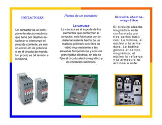 El documento describe las principales partes de un contactor eléctrico. Un contactor es un dispositivo electromecánico que puede establecer o interrumpir la corriente eléctrica. Sus partes principales son: la bobina, el núcleo metálico en forma de E, la armadura móvil, las espiras de sombra que crean un flujo magnético auxiliar, y la carcaza aislante que soporta los demás elementos. El circuito electromagnético está conformado por la bobina, el núcleo y la armad