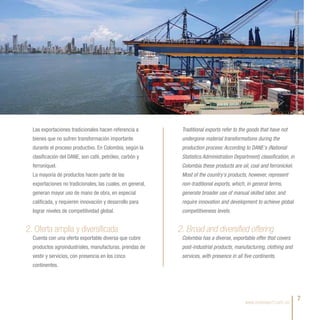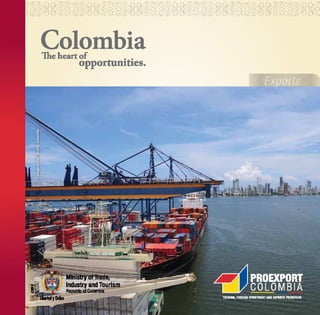 El documento describe las oportunidades de exportación en varios sectores de Colombia, incluyendo el sector agroindustrial, manufacturas, prendas de vestir y exportación de servicios. Resalta las ventajas competitivas de Colombia como su biodiversidad, capacidad agrícola, mano de obra talentosa y canasta exportadora diversificada con sellos de calidad. Invita a conocer más sobre los productos colombianos.