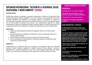 El documento presenta la información sobre un Diplomado Internacional en Gestión de la Seguridad, Salud Ocupacional y Medio Ambiente (SSOMA) impartido por CESAP Altos Estudios. El diplomado busca capacitar a recursos humanos en el establecimiento de sistemas de administración de SSOMA. Cubre 11 módulos con normativas, identificación de riesgos, auditorías, y cuenta con docentes expertos en seguridad e higiene industrial. Se ofrece de forma presencial, semipresencial y virtual con certific