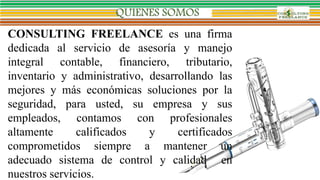 Consulting Freelance es una firma de asesoría integral en contabilidad, finanzas, tributación e inventario, que ofrece soluciones personalizadas y económicas con un enfoque en la calidad y el control. Su misión es promover el desarrollo económico y social mediante políticas económicas sostenibles, mientras que su visión busca asegurar una gestión eficaz y ética en la política económica. Entre sus servicios se incluyen auditoría, consultoría, asesoramiento fiscal, planificación financiera y outsourcing contable, todos garantizados por profesionales calificados.