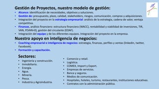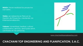 Chachani Top Engineering and Planification, S.A.C. se dedica a la gestión exitosa de proyectos con una visión de ser un referente en Perú. Ofrecen servicios en diversos sectores y aplican metodologías ágiles para garantizar la ejecución de proyectos desde su concepción hasta su materialización. La empresa se enfoca en la colaboración, la honestidad y la capacitación, integrando el proyecto en la estrategia empresarial y brindando apoyo en inteligencia de negocios.