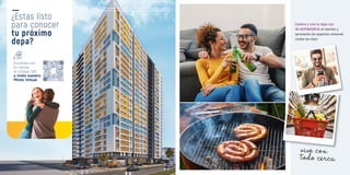 El documento promociona un proyecto de departamentos llamado IN+ que ofrece independencia y espacios comunes como guardería, sala de juegos, estacionamiento, terraza y más. Describe las características de los departamentos incluyendo sala, comedor, cocina, baño y dormitorios, y destaca las áreas comunes como lobby, coworking, sala lounge, parrilla y gimnasio.