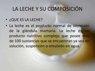 La leche es un producto complejo que contiene más de 100 sustancias como proteínas, grasas, lactosa y minerales. Estas sustancias se encuentran en solución, suspensión o emulsión en el agua. La leche se pasteuriza, esteriliza o procesa con UHT para eliminar microorganismos y aumentar su vida útil. La leche cruda se enfría rápidamente, se transporta en camiones cisterna y se procesa térmicamente antes de envasarse.