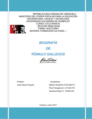 Rómulo Gallegos fue un novelista y político venezolano nacido en 1884 en Caracas. Se destacó como escritor con novelas como Doña Bárbara (1929), que describe la lucha entre la civilización y la barbarie en los Llanos venezolanos. Otras obras importantes incluyen Cantaclaro (1934) y Canaima (1935). Gallegos también se desempeñó como profesor y director de varias escuelas. Falleció en 1969 en Caracas luego de una prolífica carrera literaria en la que