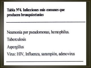 La bronquiectasia es la dilatación permanente de los bronquios que puede ser congénita, adquirida por inflamación recurrente o infección. Puede clasificarse en cilíndrica, varicosas o quísticas. Sus manifestaciones clínicas incluyen tos productiva, hemoptisis y disnea. El diagnóstico incluye radiografía de tórax y TAC. El tratamiento consiste en fisioterapia respiratoria, antibióticos, mucolíticos y corticoides para controlar la inflamación y las infecciones.