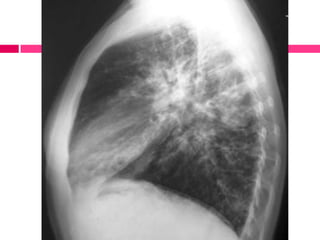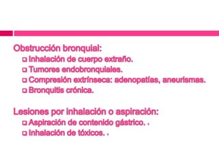 El documento describe las bronquiectasias, caracterizadas por bronquios dilatados con secreciones mucopurulentas y un cuadro clínico que incluye tos crónica y dificultad para respirar. Se mencionan diferentes tipos de bronquiectasias y condiciones asociadas, como fibrosis quística y trastornos autoinmunes. El diagnóstico incluye evaluación clínica y radiografía, con un enfoque en el tratamiento de las exacerbaciones y la eliminación de secreciones.