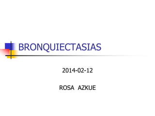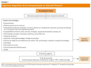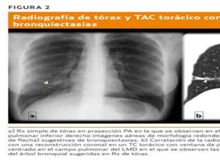 Este documento resume las bronquiectasias, una patología pulmonar crónica caracterizada por la dilatación irreversible de los bronquios. Generalmente es consecuencia de infecciones o inflamaciones repetidas y su prevalencia es mayor en mujeres y personas de edad avanzada. Los síntomas incluyen tos crónica con expectoración, neumonías recurrentes y disnea. El diagnóstico se realiza mediante radiografía de tórax, TAC y broncoscopia, y requiere un tratamiento individualizado que incluye antibióticos, fisioter