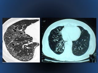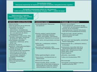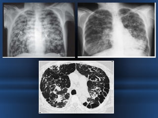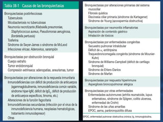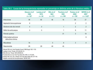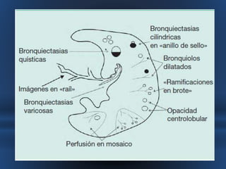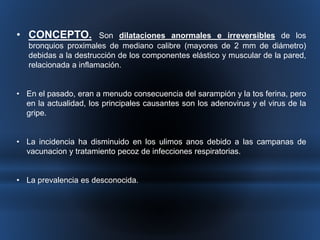 Este documento describe las bronquiectasias, que son dilataciones anormales e irreversibles de los bronquios proximales causadas por inflamación y destrucción de los tejidos. Las bronquiectasias pueden ser el resultado de infecciones virales o bacterianas, obstrucciones, asma u otras enfermedades. Se diagnostican mediante tomografía computarizada de alta resolución y su tratamiento consiste en eliminar obstrucciones, mejorar la eliminación de secreciones y controlar infecciones con antibióticos.