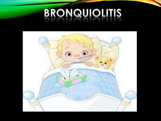 Este documento describe la bronquiolitis, una infección viral común del tracto respiratorio inferior en lactantes menores de 2 años. Se caracteriza por dificultad respiratoria de grado variable y sibilancias. Los principales virus causantes son el virus sincitial respiratorio, parainfluenza y rinovirus. El tratamiento se enfoca en medidas de soporte como oxigenoterapia y hidratación.