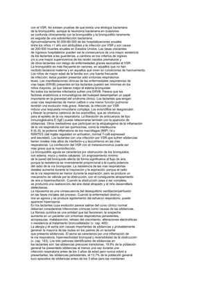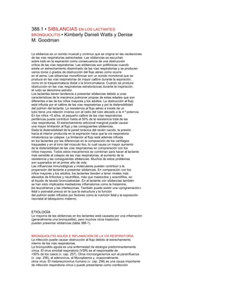 Este documento describe las sibilancias en lactantes, en particular la bronquiolitis. Explica que las sibilancias son sonidos continuos producidos por la obstrucción de las vías respiratorias, y que los lactantes son propensos debido al pequeño tamaño de sus vías respiratorias. La causa más común es la bronquiolitis aguda, generalmente causada por virus como el virus sincitial respiratorio. Describe los mecanismos fisiopatológicos y factores que contribuyen a la gravedad, así como otros trastornos que