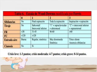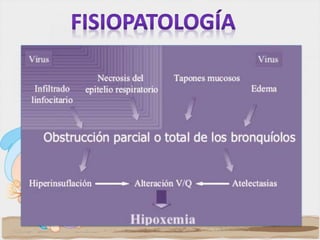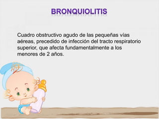 La bronquiolitis es una infección aguda de las pequeñas vías respiratorias que afecta principalmente a niños menores de 2 años. Es causada principalmente por el virus sincitial respiratorio. Los síntomas incluyen rinorrea, tos, dificultad respiratoria y sibilancias. El diagnóstico es clínico. El tratamiento depende de la gravedad y puede incluir broncodilatadores, corticoesteroides y oxígeno suplementario.