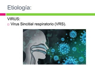 La bronquiolitis es causada principalmente por el virus sincitial respiratorio. Afecta a niños menores de 2 años, especialmente entre los 3 y 6 meses, y se presenta típicamente en los meses de noviembre a marzo. Los síntomas incluyen rinorrea, tos, fiebre y dificultad respiratoria progresiva. El diagnóstico se basa en la historia clínica y el examen físico, y el tratamiento consiste en hidratación, oxígeno, broncodilatadores y control de la fiebre.