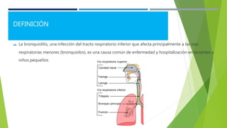 La bronquiolitis es una infección común de las vías respiratorias inferiores en lactantes y niños pequeños, causada principalmente por virus. Los síntomas incluyen tos, dificultad respiratoria y sibilancias. El diagnóstico se realiza clínicamente y el tratamiento se enfoca en aliviar los síntomas y controlar las complicaciones como la deshidratación. La hospitalización puede ser necesaria en casos graves.