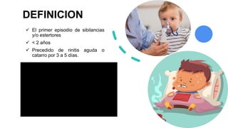 La bronquiolitis aguda es una infección respiratoria común en niños menores de 2 años causada principalmente por el virus sincitial respiratorio. Los síntomas incluyen tos persistente, dificultad respiratoria y sibilancias. El diagnóstico es clínico y el tratamiento consiste en medidas de apoyo como oxígeno suplementario y suero salino. Las complicaciones potenciales son deshidratación, neumonía por aspiración e insuficiencia respiratoria.