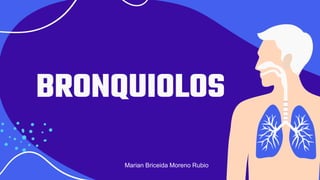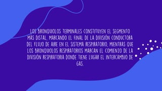 Los bronquiolos son pequeños conductos pulmonares formados por la ramificación de los bronquios que conducen el aire a los alveolos, donde ocurre el intercambio de gases. A diferencia de los bronquios, los bronquiolos no tienen cartílagos. Sus funciones incluyen llevar el aire a los alveolos, descontaminar el aire inspirado, desencadenar la tos, y reducir o aumentar el flujo de aire cambiando de diámetro.