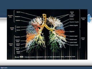 Este documento describe la anatomía de los bronquios y los pulmones. Explica que los bronquios se dividen en principales, lobares y segmentarios, los cuales se ramifican en bronquiolos y finalmente en alvéolos, donde ocurre el intercambio gaseoso. Describe las características de cada parte del sistema respiratorio y su función en la respiración.