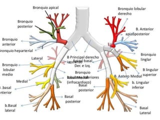 El documento resume la anatomía de los bronquios y bronquiolos. Describe que la tráquea se divide en dos bronquios principales, uno derecho y otro izquierdo, que penetran en cada pulmón. Explica la estructura y ramificación del árbol bronquial hasta llegar a los bronquiolos terminales y alvéolos. También cubre las relaciones de los bronquios con otras estructuras y vasos sanguíneos y linfáticos asociados.