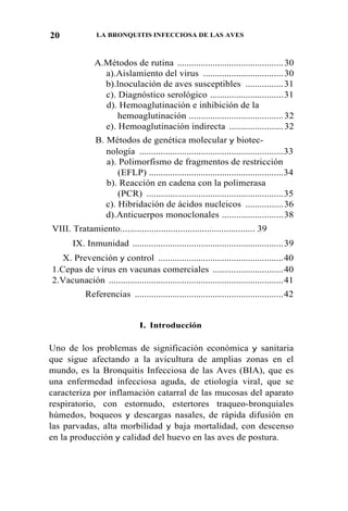 El documento resume la Bronquitis Infecciosa de las Aves (BIA), una enfermedad viral aguda que afecta a las aves de granja. La BIA es causada por un coronavirus que se replica en el tracto respiratorio superior de las aves infectadas. Los signos clínicos incluyen estornudos, descargas nasales y reducción en la producción de huevos. El virus se transmite rápidamente entre aves a través de aerosoles. No existe tratamiento específico, pero la enfermedad puede prevenirse mediante vacunación.