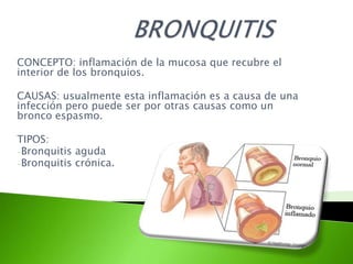 La bronquitis es la inflamación de los bronquios causada comúnmente por infecciones virales o bacterianas. Puede ser aguda o crónica. La bronquitis aguda dura menos de 3 meses y suele resolverse sola, mientras que la crónica dura más de 3 meses y es más común en fumadores. El tratamiento incluye antibióticos para infecciones bacterianas, broncodilatadores y expectorantes.
