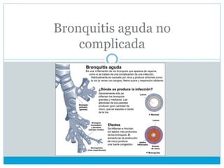 La bronquitis aguda no complicada se define como una inflamación aguda de la mucosa bronquial e hipersecreción de las glándulas mucosas de los bronquios, caracterizada por tos de comienzo agudo o subagudo de 3 semanas o más, generalmente causada por infecciones virales. Los síntomas principales incluyen fiebre, expectoración purulenta, taquicardia y dolor retroesternal. El tratamiento se enfoca en medidas generales como dejar de fumar y buena hidratación, y el uso de antivirales, antitusic